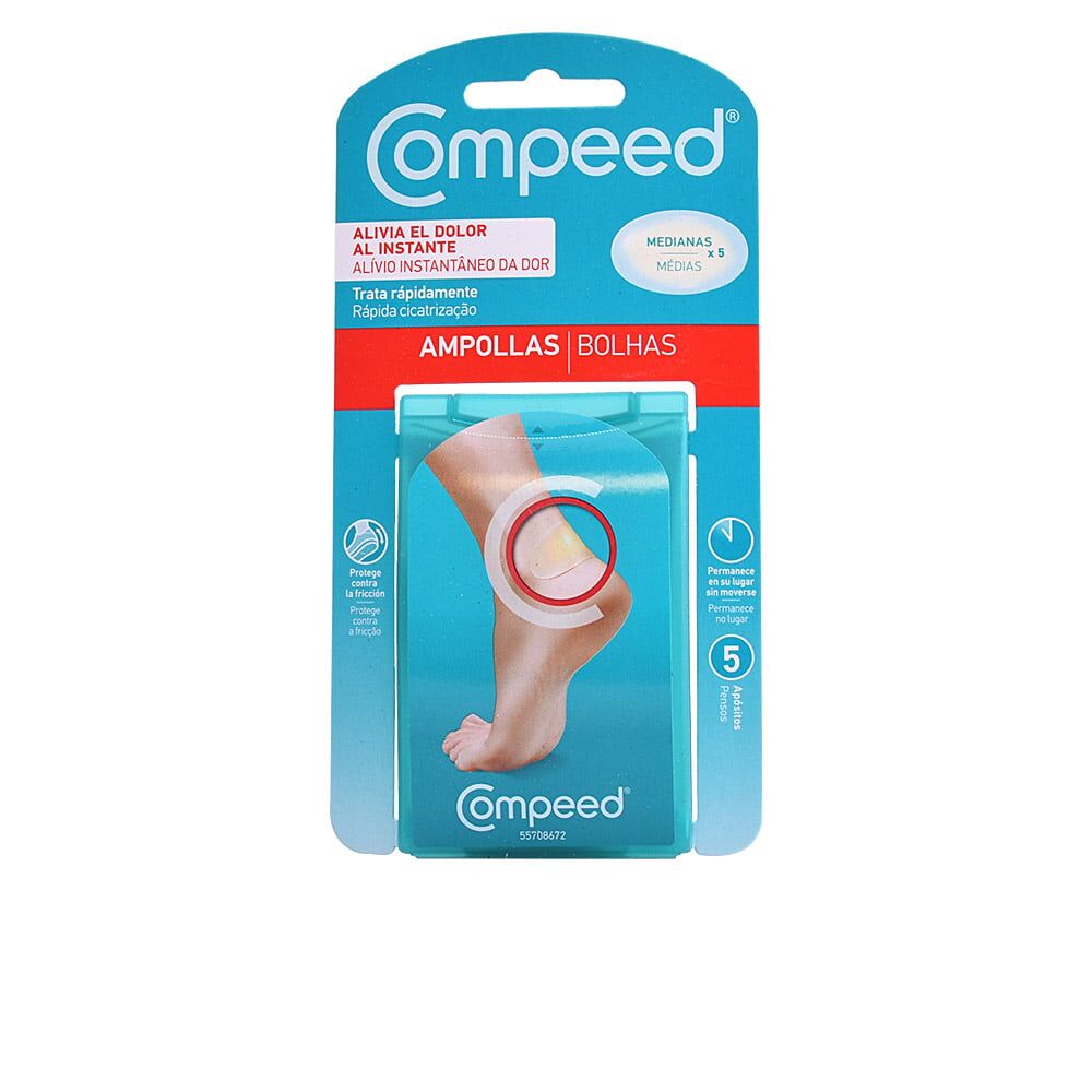 COMPEED Ampollas Medianas no es un apósito normal y corriente. Su avanzada tecnología hidrocoloide actúa como una segunda piel formando un gel protector que alivia el dolor al instante y evita la fricción, a la vez que crea un entorno óptimo para permitir una rápida cicatrización.