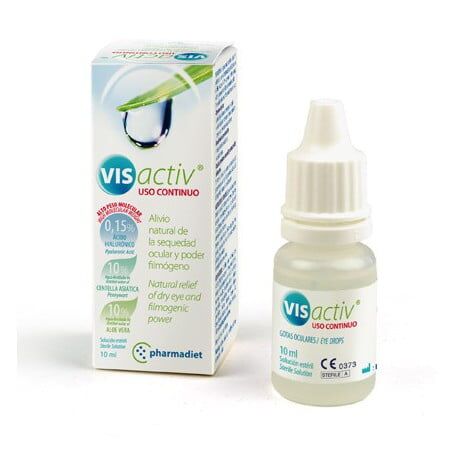 Visactiv Uso Continuo Pharmadiet está elaborado con agua destilada de Aloe vera y de Centella asiatica y Ácido Hialurónico. La acción de estas tres sustancias evita la sequedad ocular.